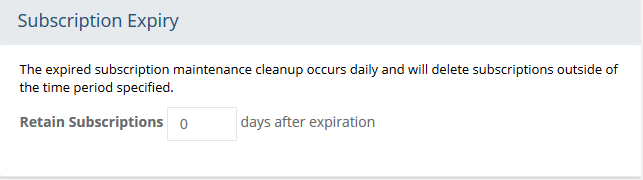 Subscription ExpirySubscriptions are a type of product sold by the merchant with a delivery schedule. Upon purchase, subscription is generated and associated to the existing order and any future orders. The subscriptions are managed by the merchant or customer. When new subscriptions are created, the merchant can define an expiration based on the total number of payments. Once the subscription has expired, it can still be viewed until such a time that it is deleted from the system. From this page, you can set the number of days that the subscription will be shown (but expired) before being purged by the maintenance schedule. The default expiration date of a subscription is created when it is purchased, but not all subscription have to expire. When the subscription expires, it will automatically be removed from the system through maintenance. You can use this feature to retain records of the expired subscription.