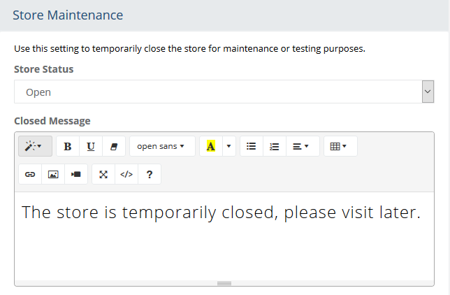 MaintenanceTable of Contents Show Store MaintenanceThe Store Maintenance feature allows you to temporarily close the store for upgrades, maintenance, testing, or any time you need to "close your doors". The store can be closed to all users or only to users who are not part of an administration group. You can customize the message that will be displayed when a user tries to access any page in the store.