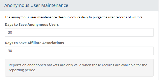 Anonymous User MaintenanceAn anonymous user is any person (another computer) who has accessed your store and hasn't registered or logged into an existing account. An anonymous user can also be a customer who placed an order but chose to not register at time of checkout. The anonymous user settings are used to provide information to the merchant regarding users who have not completed a checkout or registered in the store. The data collected on these potential customers can be viewed in various reports.