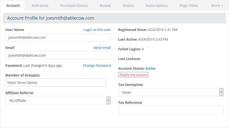 User AccountsTable of Contents Show User AccountsAbleCommerce allows you to create new users from the Merchant Menu. A user can also be created by registration at checkout, through a mailing list sign-up, or from a new wishlist. For each user registration, you'll be able to view information like their current and past orders, page views, and more. Users can be assigned to your custom groups. When new users are created automatically by the system, they will not be assigned to any Group. A Group can be given special privileges or memberships, like the ability to receive tax exemption is one example. The AbleCommerce system includes several security groups with permissions to manage different areas of the store. The anonymous user record can be stored if the user visiting your store has allowed a 'cookie' to be stored in their browser. This is very common, so most anonymous users browsing your store can be tracked to some degree. For information on tracking settings, see Anonymous User Maintenance. In order to make use of the Abandoned Basket report, you'll need to track these anonymous users. Account ProfileA user's account profile can be accessed through several methods. To find this page, use the menu and go to People > Users > Manage Users. This is the User Manager which has its own documentation. Use the search form to find and edit a user's record. Each user will have an account with several features. These pages are accessible from the tabs, where you can view detailed information about the user, order history, and activities including page views, basket contents, and more. The first page you will see after editing a user record is the Account summary page showing the most common user information.