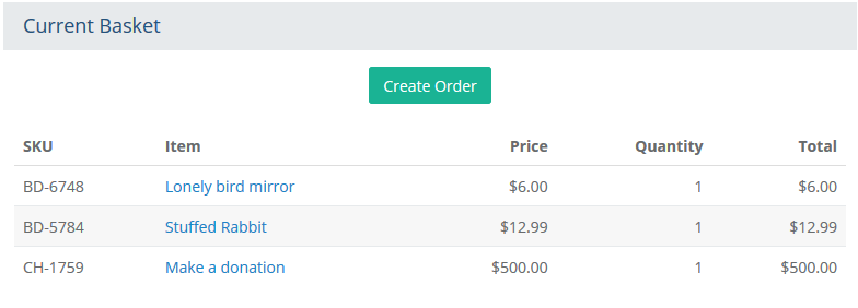 User's Current BasketThe Basket tab will display any items that are currently in the user's shopping cart. You can complete an existing shopping session from this page.