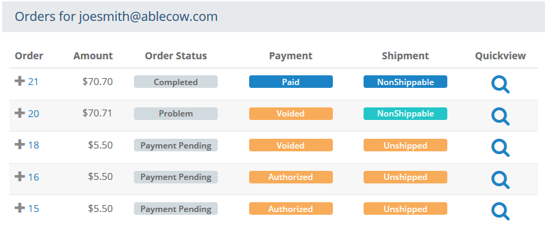 User's OrdersThe Orders tab will display all orders placed by the user. You can access any order by clicking the Quickview icon in the far right column.
