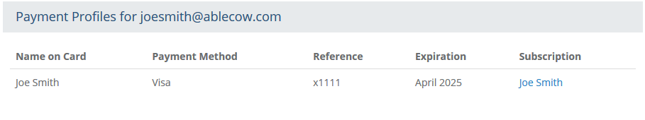 User's Payment ProfilesThe Payment Profiles tab appears when the configuration for Authorize.net's Customer Information Management (CIM) feature is enabled along with Recurring Subscriptions or when registered users have the option to save credit cards. The latter is a checkout option available from the store settings page. Note: A payment profile is not stored in the application's database, instead, the information is held by Authorize.net. This is a secure payment storage option.