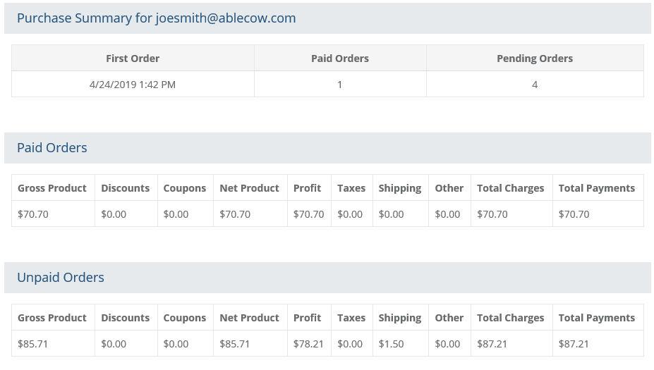 User's Purchase HistoryThe Purchase History page will show a summary of all orders placed, including the date of first order, and the number of orders placed.