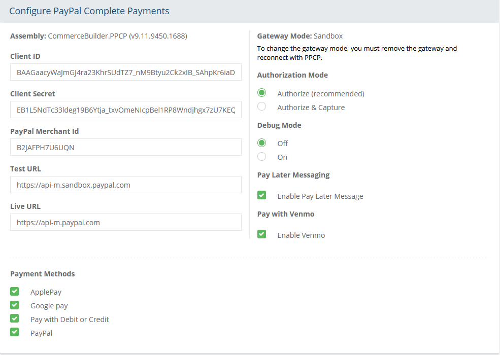 PayPal Complete Payments configuration page as shown