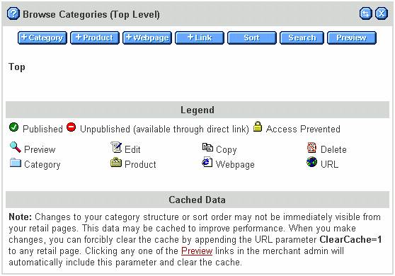 The screen shown represents a store with no categories or content. At the top of the page are buttons that provide access to the CMS and product management features. Below that is a listing of the contents of the current folder (as indicated on the title bar). Then there is a legend that helps you to identify the icons used on this menu. Finally there is a note about data caching.