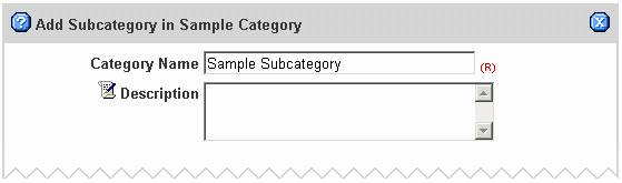 This page also has a minor difference from the Add Category screen we saw earlier. The title bar tells us that we are creating a Subcategory within the Sample Category. Other than that, the form is exactly the same.