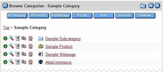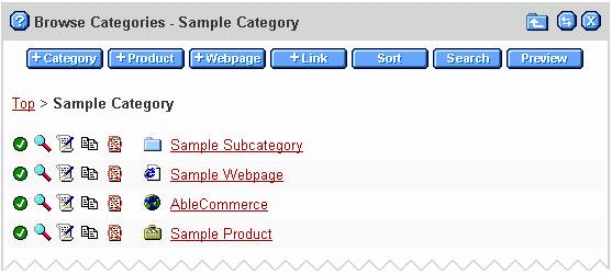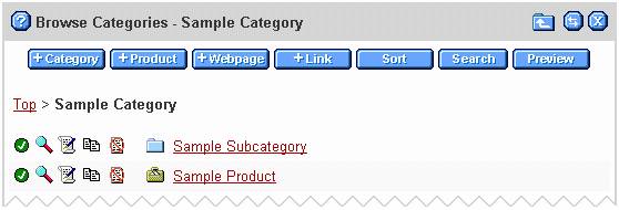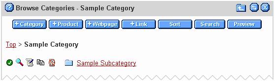 There are a few things to notice on this screen. First look at the title bar. It shows that we are viewing the contents of the Sample Category. To the right of that there is a new icon, a folder with an up arrow. Clicking this icon will take you to the one level up (in this case, the top level). Last, you can see that the category trail now reflects our current position: Top > Sample Category.