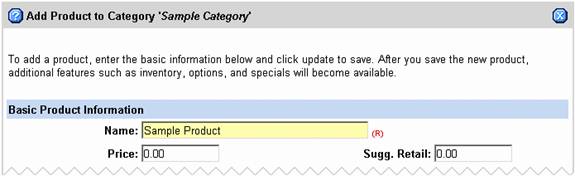 Note that the title bar identifies the category we are adding the product to. For the purposes of this example, you only need to enter in the product name. Then click the Update button. You will remain at the edit product page, with a message stating the product was saved. Click the X at the upper right to return to the category listing, where the new product will now appear. Notice that the action buttons are the same for the product listing, but the product icon is used instead of the category icon.