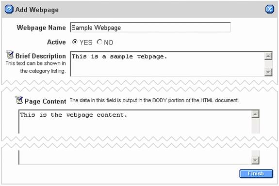 The remainder of the fields of the form can be left with the default data for this example. When you finish filling out the form, click Finish to return to the category listing where the new webpage will be shown.