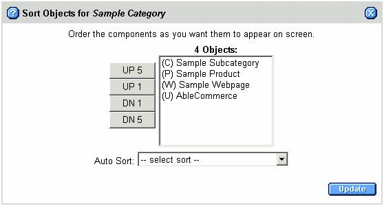 So far, every object we have added to the category has appeared at the bottom of the list. Usually, items are not entered in the order they should be displayed. We can use the sorting feature to put the items into the desired order. Click the Sort button to open the screen below.