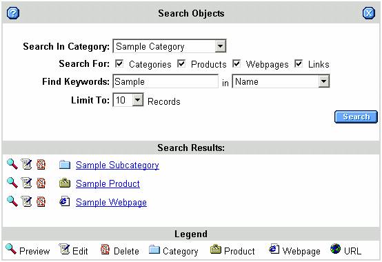 If your store contains a large number of content objects, browsing through your category tree may not be the fastest way to find what you are looking for. The content management system also provides a search feature so that you can look for objects by keyword and type. Simply click the “Search” button to open the Search Objects form. Then fill in the criteria for the object you want to access and click Search. Your results will look similar to the following screen.