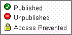 Unpublished items are identified by a red circle with a horizontal white line through the center. Clicking on the icon will switch the status of the item to Access Prevented.