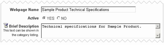 First, create a webpage content object that will contain the technical specifications. Step by step instructions for creating a webpage object are given above, so they will not be repeated here. For our example store, we have created a new webpage named “Sample Product Technical Specifications” filled with sample content.