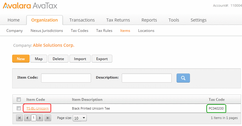 code of TS-BL-Unicorn. AvaTax will find the item code defined
